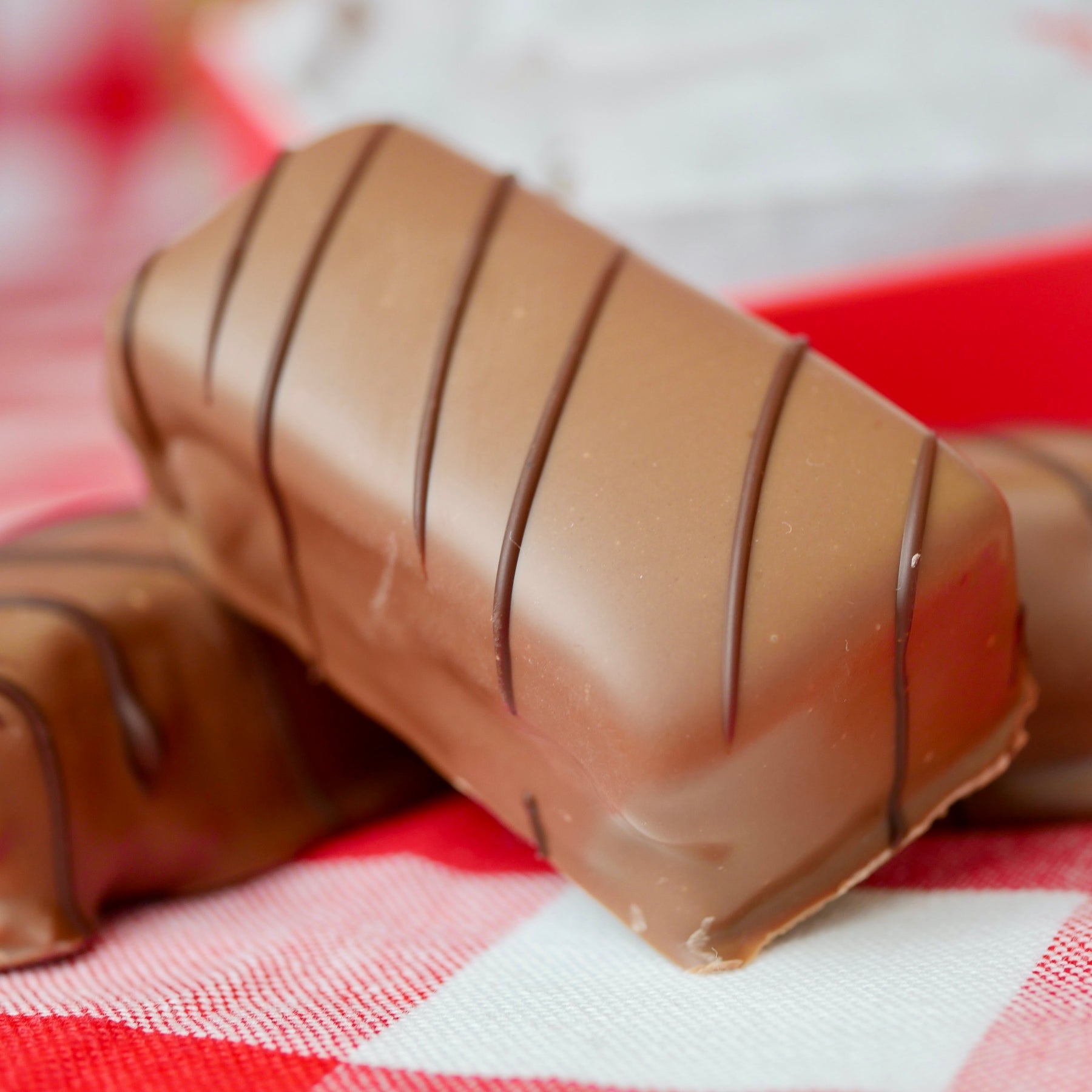 Our Fluffernutter Candy Bar is an elevated version of the sandwich, blending fresh vanilla nougat with crunchy peanut butter filling coated in premium, Belgian milk chocolate.