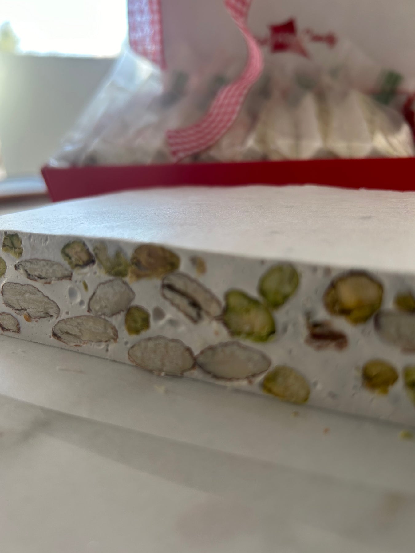 sugar, pistachios, almonds, honey, brown rice syrup, egg whites, cocoa butter, vanilla