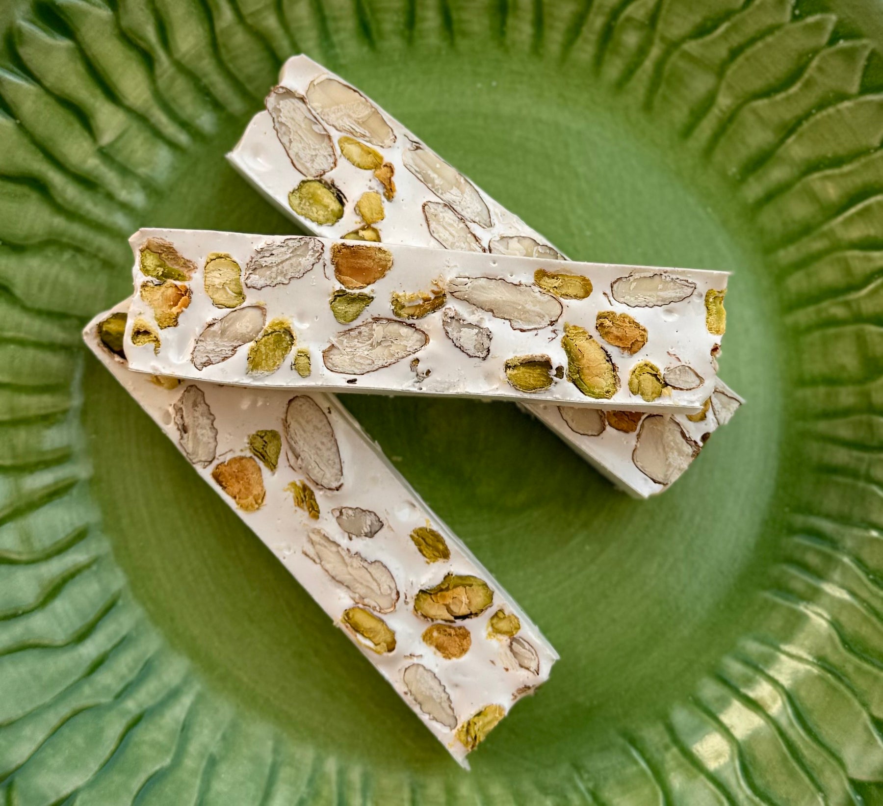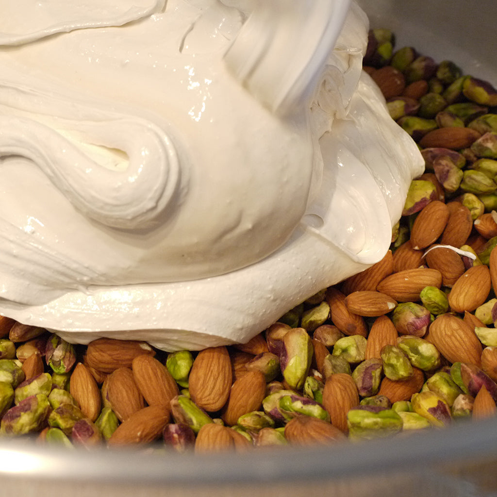 Our version of the French classic, Nougat de Montélimar, starts with honey from local bees, egg whites from local chickens, and organic sugar. Once beaten to a fluff, we fold in pistachios and roasted California almonds for a final treat of light, chewy bars with accents of honey and bold nut flavors.